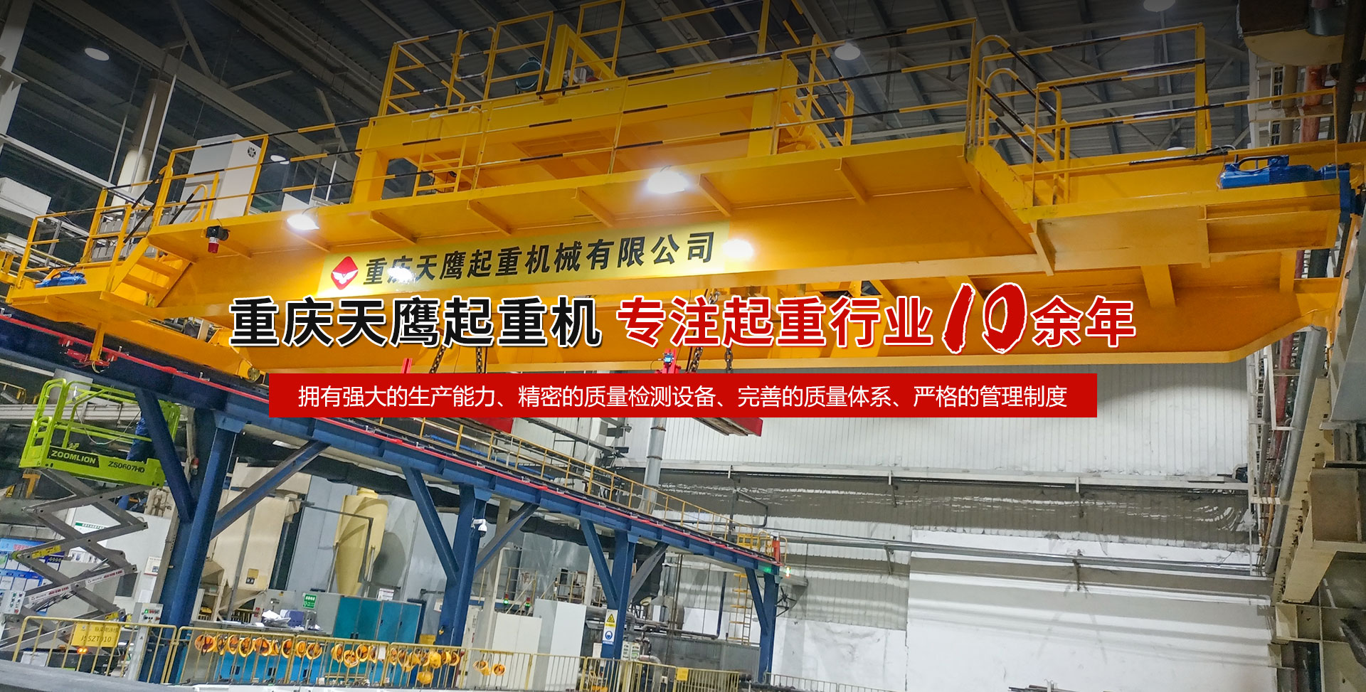 重慶天鷹起重機(jī)械有限公司成立于2014年,主營(yíng)起重機(jī)的銷(xiāo)售、安裝和維護(hù)等相關(guān)服務(wù)。中國(guó)重型機(jī)械工業(yè)協(xié)會(huì)員單位、為中國(guó)工程機(jī)械工業(yè)協(xié)會(huì)工程機(jī)械維修分會(huì)會(huì)員單位及西南地區(qū)起重機(jī)械定點(diǎn)安裝維修單位。具有國(guó)家質(zhì)量監(jiān)督檢疫總局頒發(fā)的特種設(shè)備安裝維修改造質(zhì)格證書(shū)。并率先通過(guò)了IS09001-2000質(zhì)量體系認(rèn)證?! 」咀?cè)資金3000萬(wàn)元;廠(chǎng)房面積2萬(wàn)平方米;各種生產(chǎn)檢測(cè)設(shè)備50臺(tái)套,公司技術(shù)力量雄厚,聘請(qǐng)了國(guó)內(nèi)知名起重機(jī)專(zhuān)家、工程技術(shù)人員擔(dān)當(dāng)項(xiàng)目經(jīng)理、技術(shù)總工程師及顧問(wèn)。現(xiàn)擁有員工100多人,其中工程技術(shù)人員12人?! ≈鲗?dǎo)產(chǎn)品為各類(lèi)橋、門(mén)式起重機(jī)及輕小型起重設(shè)備,具備生產(chǎn)起重量200t及以下通用橋、門(mén)式起重機(jī)的能力,尤其在200t以下起重機(jī)產(chǎn)品上具備較強(qiáng)的市場(chǎng)競(jìng)爭(zhēng)力,為許多行業(yè)設(shè)計(jì)制造了技術(shù)含量高、技術(shù)性強(qiáng)的起重設(shè)備,許多產(chǎn)品在原設(shè)計(jì)標(biāo)準(zhǔn)上進(jìn)行了較大的改進(jìn)、優(yōu)化和創(chuàng)新;其中NH型系列電動(dòng)葫蘆、HD型電動(dòng)單梁處于國(guó)內(nèi)高水平..... 好的產(chǎn)品品質(zhì)需要由較高的裝備水平來(lái)保證,公司購(gòu)買(mǎi)了“大型數(shù)控落地鏜”、“數(shù)控切割機(jī)床”、“自調(diào)式焊接滾輪機(jī)”、“數(shù)顯液壓板料折彎?rùn)C(jī)”、“超大型數(shù)控臥式車(chē)床”、“數(shù)控液壓水平下調(diào)式三輥卷板機(jī)”、“單柱移動(dòng)式立式車(chē)床”“擁有用于單梁生產(chǎn)的全國(guó)一條拋丸噴漆烘干線(xiàn)、葫蘆噴漆烘干線(xiàn)和全國(guó)較大的100T葫蘆試驗(yàn)臺(tái)和檢測(cè)中心”等各種先進(jìn)的加工設(shè)備,新建廠(chǎng)房面積近2萬(wàn)平方米。 質(zhì)量是企業(yè)的生命,天鷹公司依據(jù)“ISO 9001國(guó)際質(zhì)量管理體系”標(biāo)準(zhǔn),制定并完善了公司的質(zhì)量管理體制。堅(jiān)持質(zhì)量體系的內(nèi)審和外審,將質(zhì)量管理工作落實(shí)到企業(yè)生產(chǎn)經(jīng)營(yíng)的全過(guò)程?! ∧奈⑿Γ翘禚椨篮愕淖非?;天鷹的服務(wù),是您首要的選擇!因?yàn)槲覀儓?jiān)信:“誠(chéng)信是本、質(zhì)量鑄就品牌”。為您服務(wù)是我們的榮耀,勤奮而進(jìn)取的天鷹人,時(shí)刻期盼著您的到來(lái)。